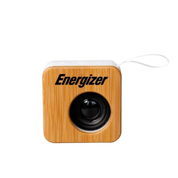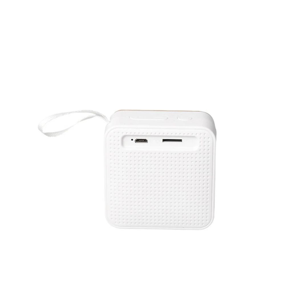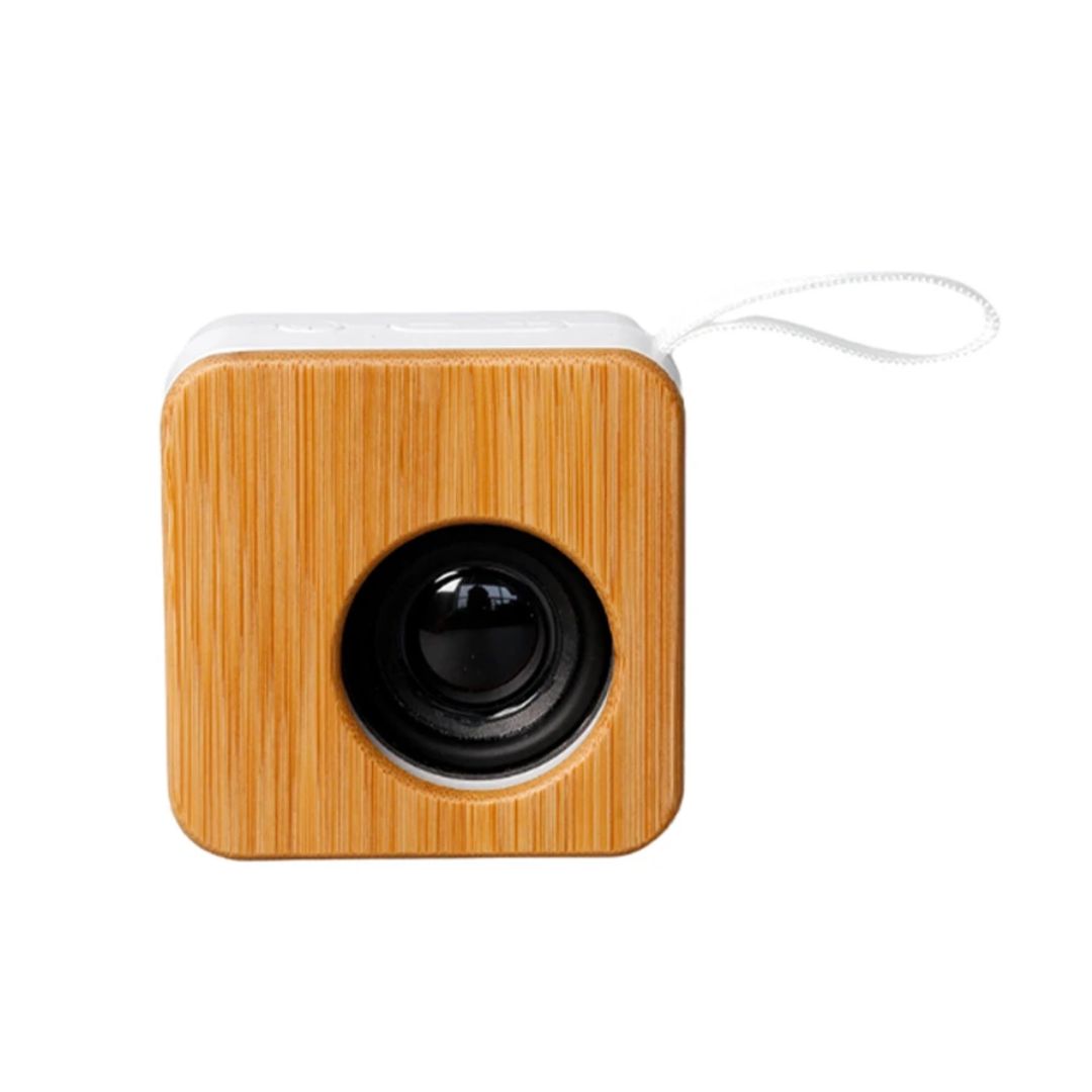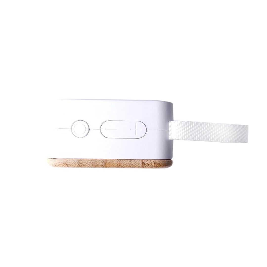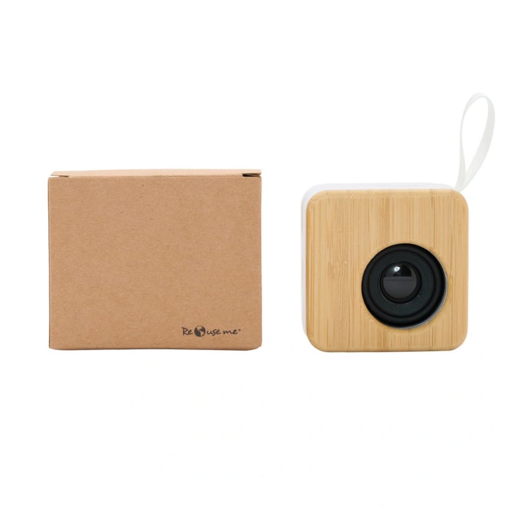 Descripción general del producto: Parlante portátil fabricado en ABS reciclado (rABS) y bambú. Tiene tecnología Bluetooth 5.0 y una batería de500 mAh que ofrece de 3 a 4 horas de reproducción. El parlante cuenta con un botón que permite encender y apagar el dispositivo, pausar y reproducir canciones, contestar y colgar llamados, cambiar a modo radio FM. El parlante cuenta con una función que permite unir dos parlantes en simultaneo para contar con reproducción estéreo. El parlante viene dentro de una caja de cartón junto a su manual de instrucciones y cable cargador. Dimensiones: 7 x 7 x 3,7 cm. Reuseme.