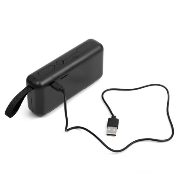 Descripción general del producto: Parlante portátil con tecnología Bluetooth, micrófono manos libres y modo radio FM, realizado en ABS. Incluye ranura para lectura de tarjetas de memoria micro SD. | Batería de 500mAh | Potencia del parlante: 3W | Conexión5V/300mA | Peso: 160g | Medidas120 x 30 x 60mm | Tahg.