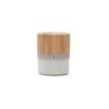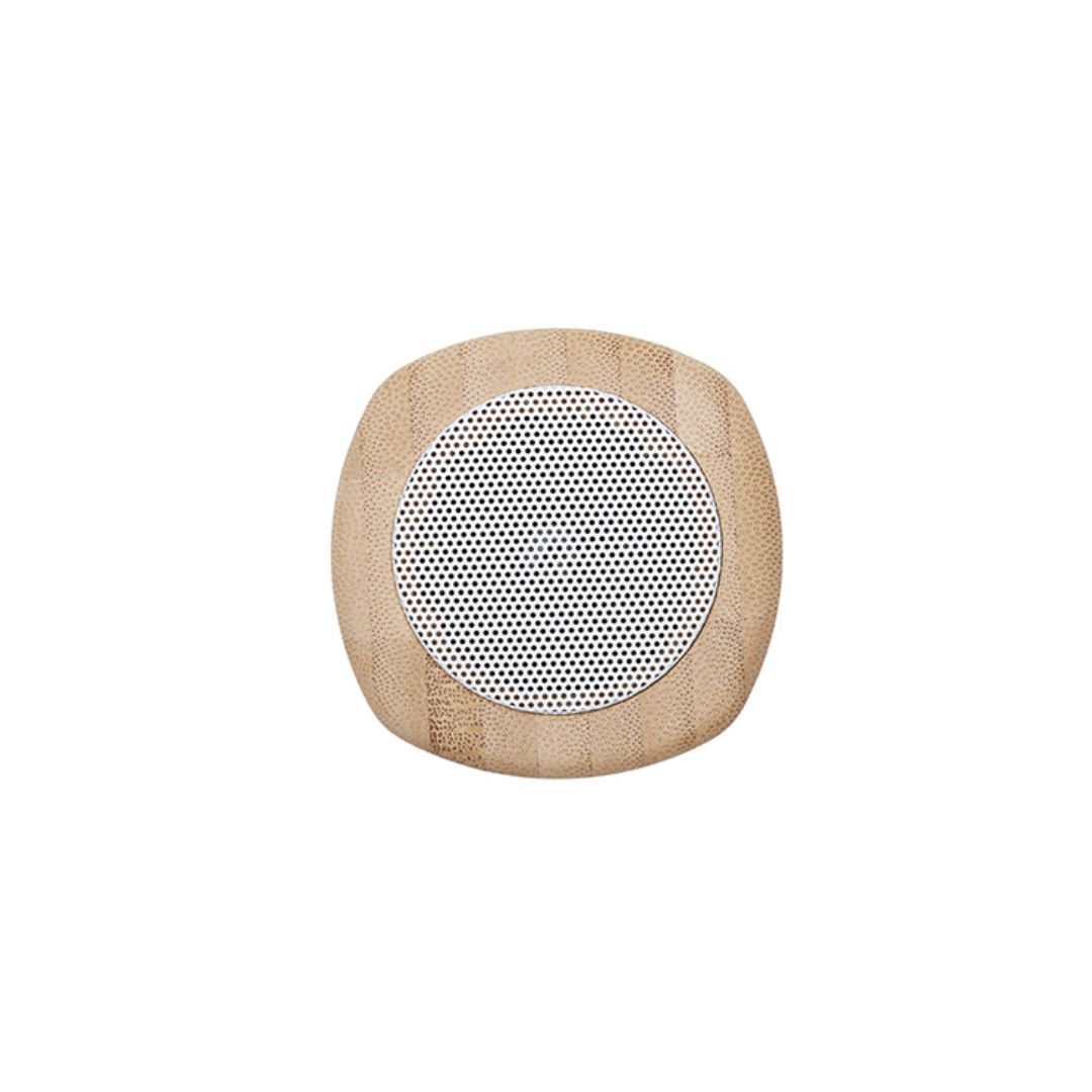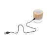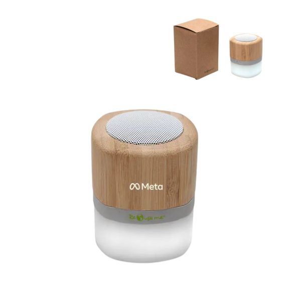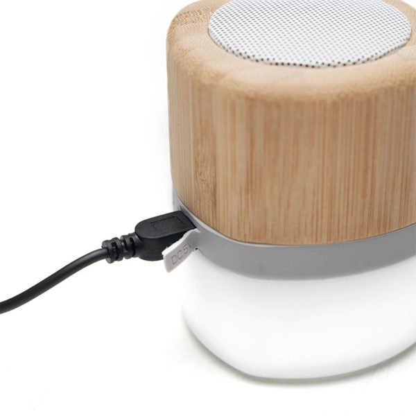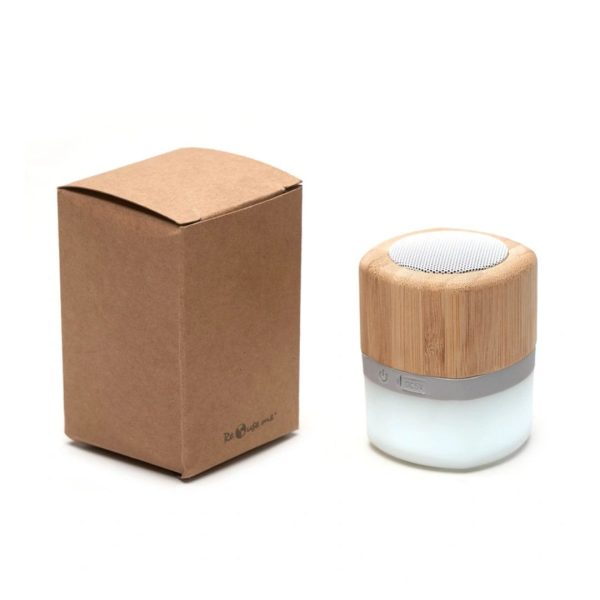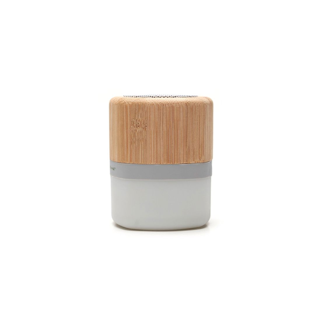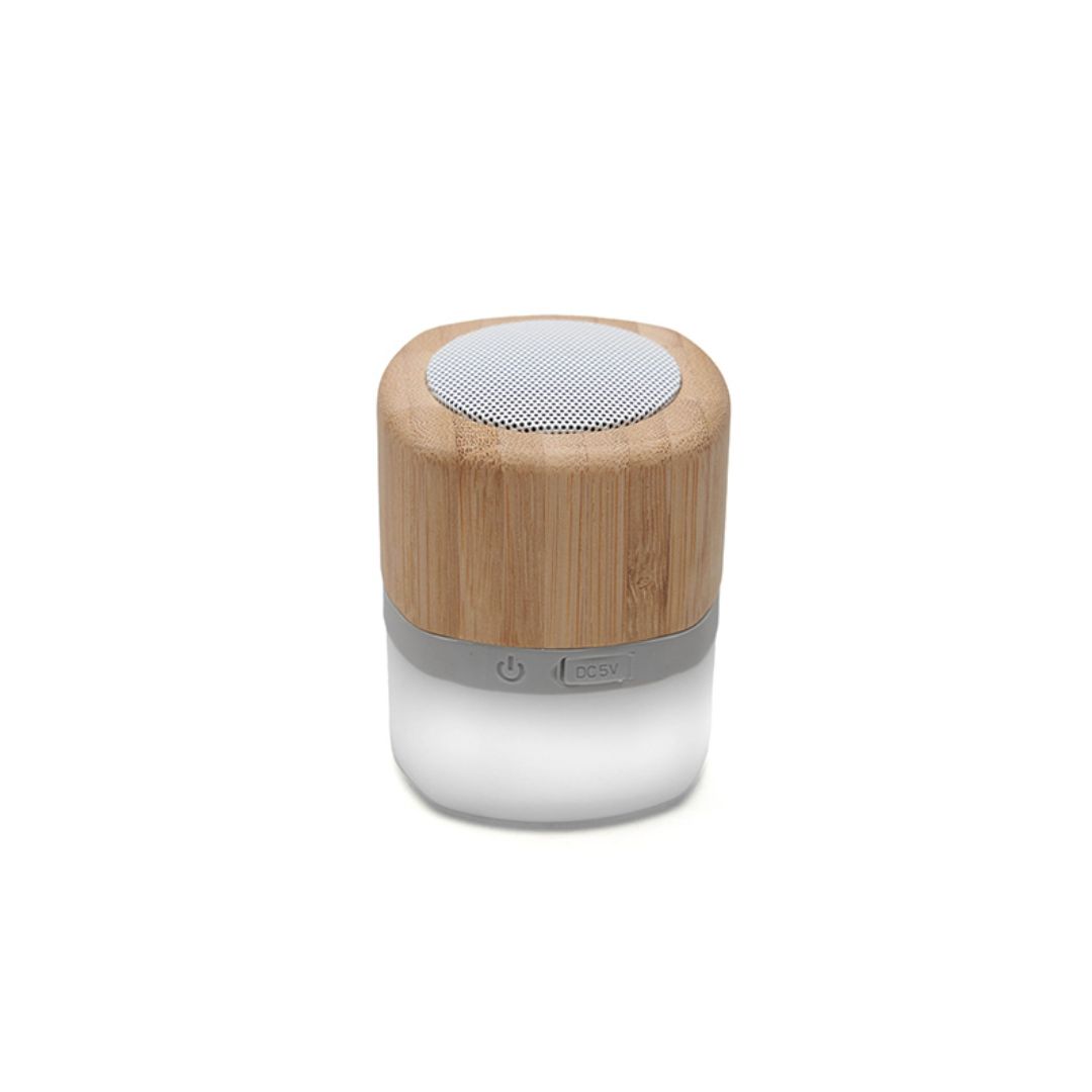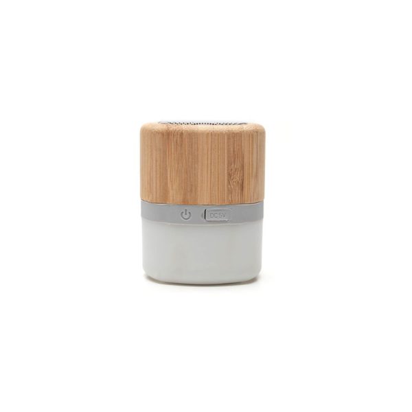 Descripción general del producto: Parlante portátil con tecnología Bluetooth. Realizado en combinación de ABS con Silicona y bamboo, con iluminación en la base. Características técnicas: Batería de 300mAh | Poder del parlante: 3W | Frecuencia: 200Hz-20KHz. Conexión: 5V / 500mA | Distancia de alcance: 10 Metros | Peso 150gr | Medidas: 6 x 6 x 7,5 cm. ReUseMe.