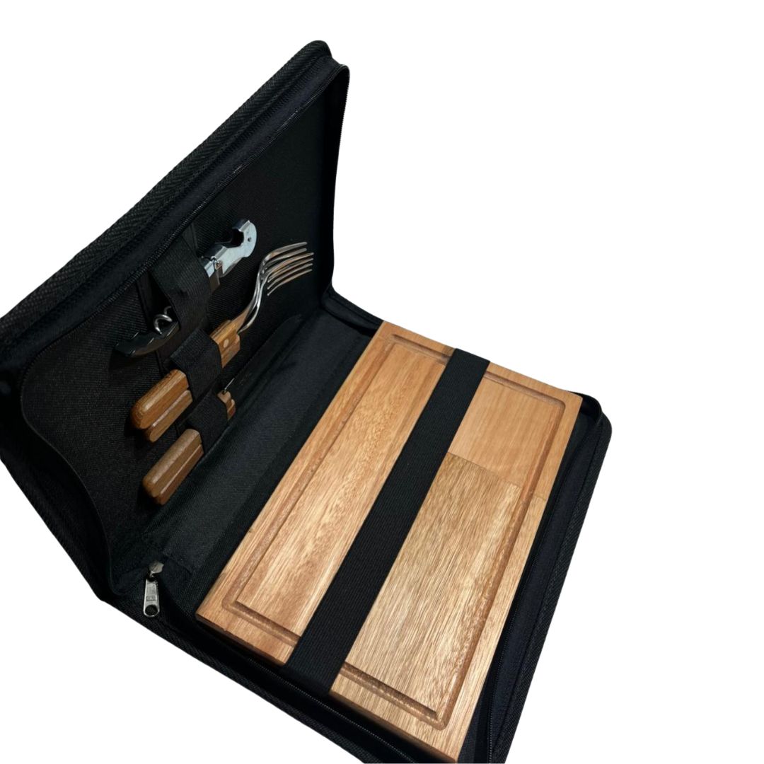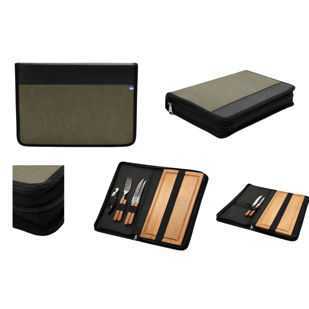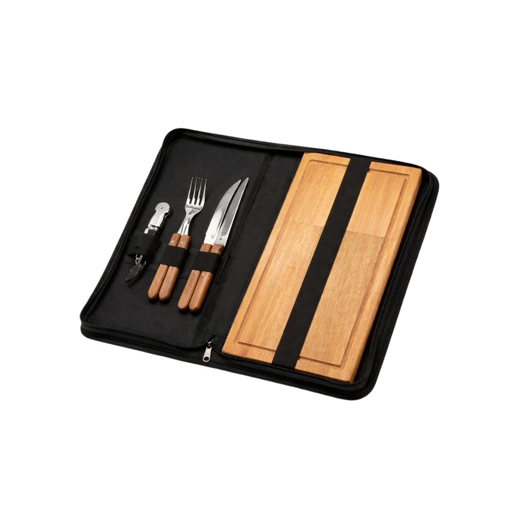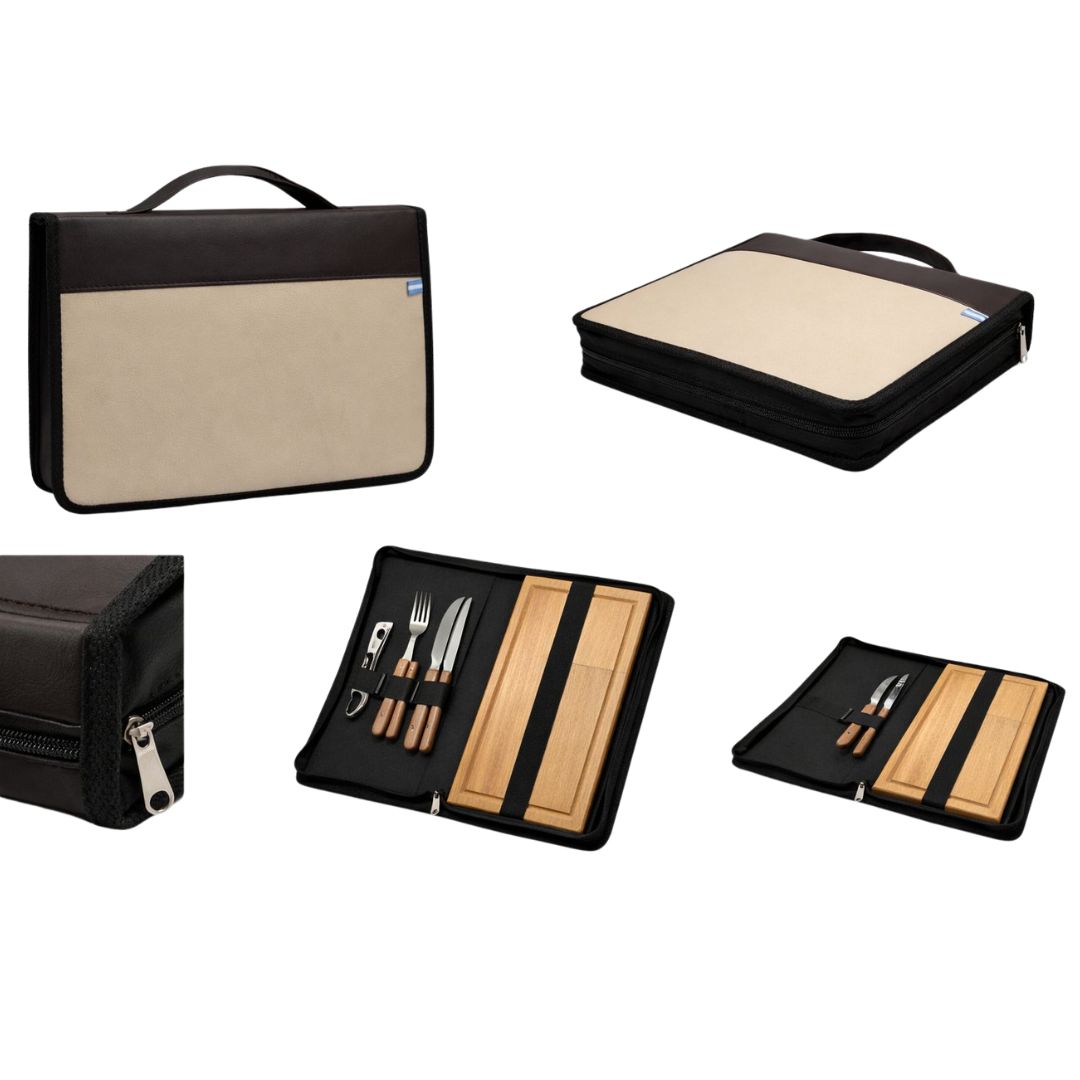 Descripción del producto: Set asador para dos personas fabricado en cartón acolchado. Exterior forrado con cuerina. Interior de cordura con elásticos reforzados para cubiertos y destapador.
