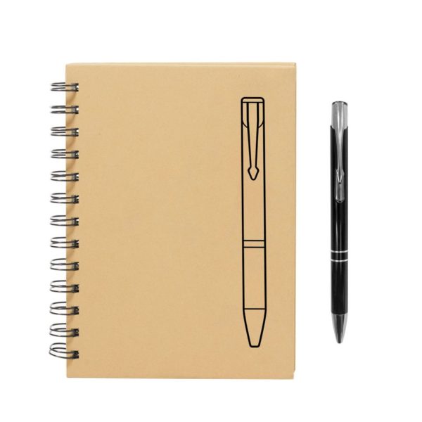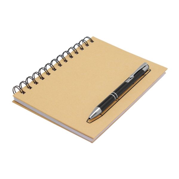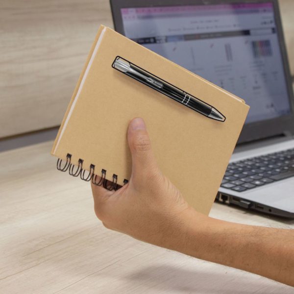 Descripción general del producto: 13 x 18 cm. Libreta color Kraft, anillado metálico y 70 hojas punteadas de 70g. Bolígrafo metálico (BP295) color negro con tinta negra. Mediante sistema de imanes el bolígrafo queda sujetado a la tapa, causando un efecto sorprendente.