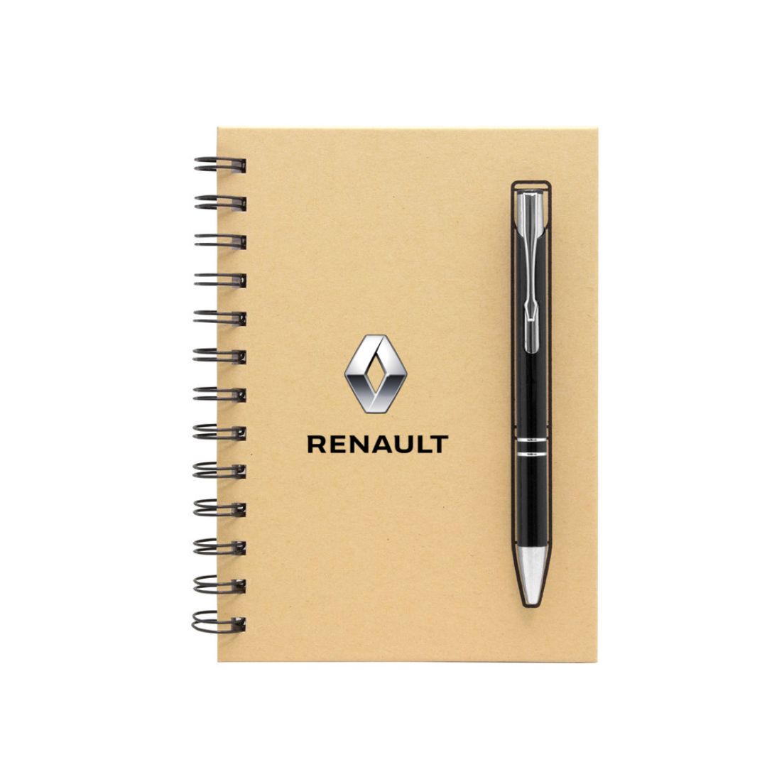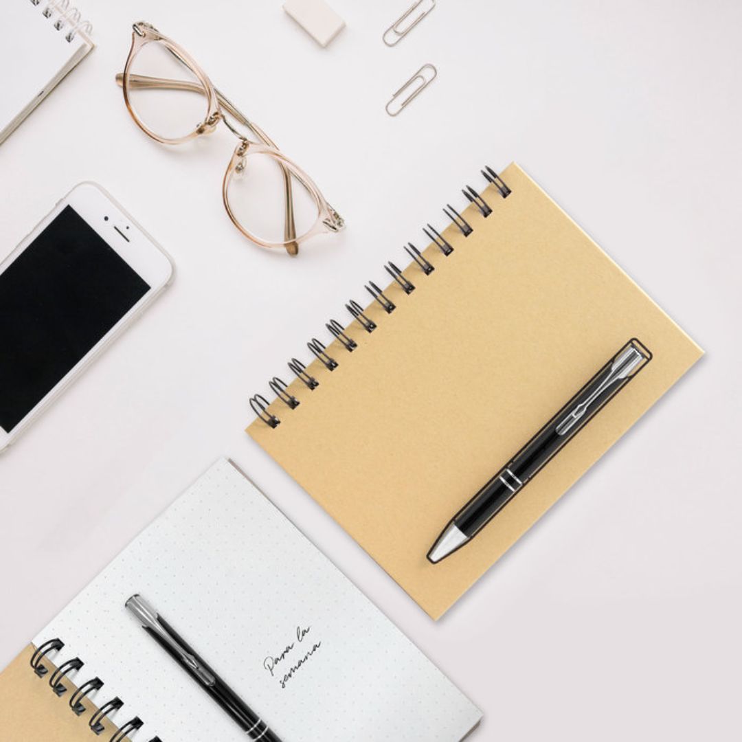 Descripción general del producto: 13 x 18 cm. Libreta color Kraft, anillado metálico y 70 hojas punteadas de 70g. Bolígrafo metálico (BP295) color negro con tinta negra. Mediante sistema de imanes el bolígrafo queda sujetado a la tapa, causando un efecto sorprendente.