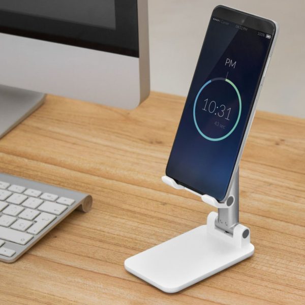 Descripción del producto: Soporte plegable para móvil. Tiene un sistema extensible de ajuste de altura e inclinación para posicionar el celular. Base con apliques de silicona antideslizantes.