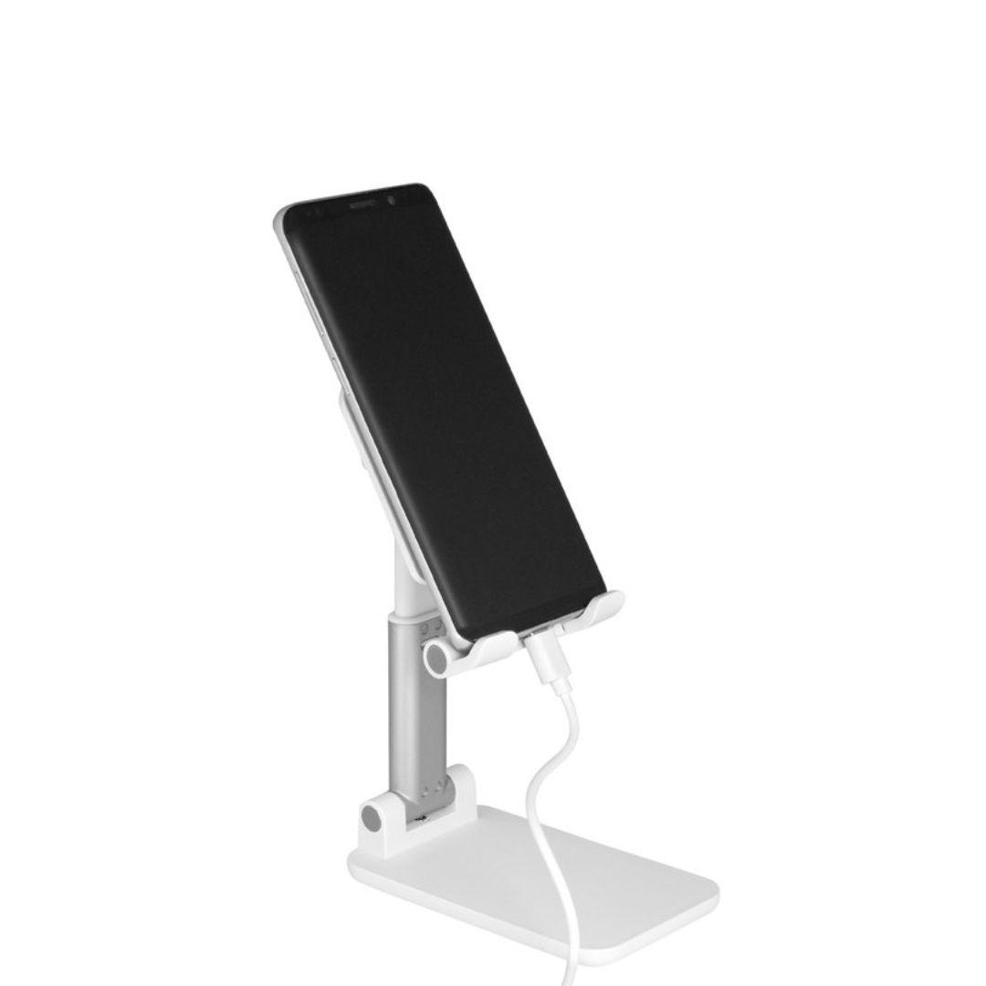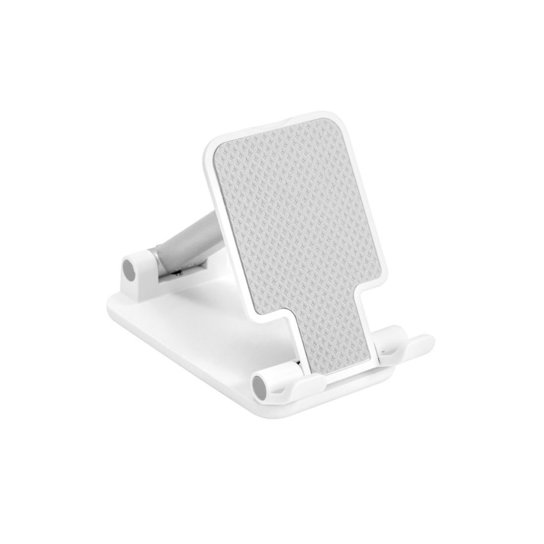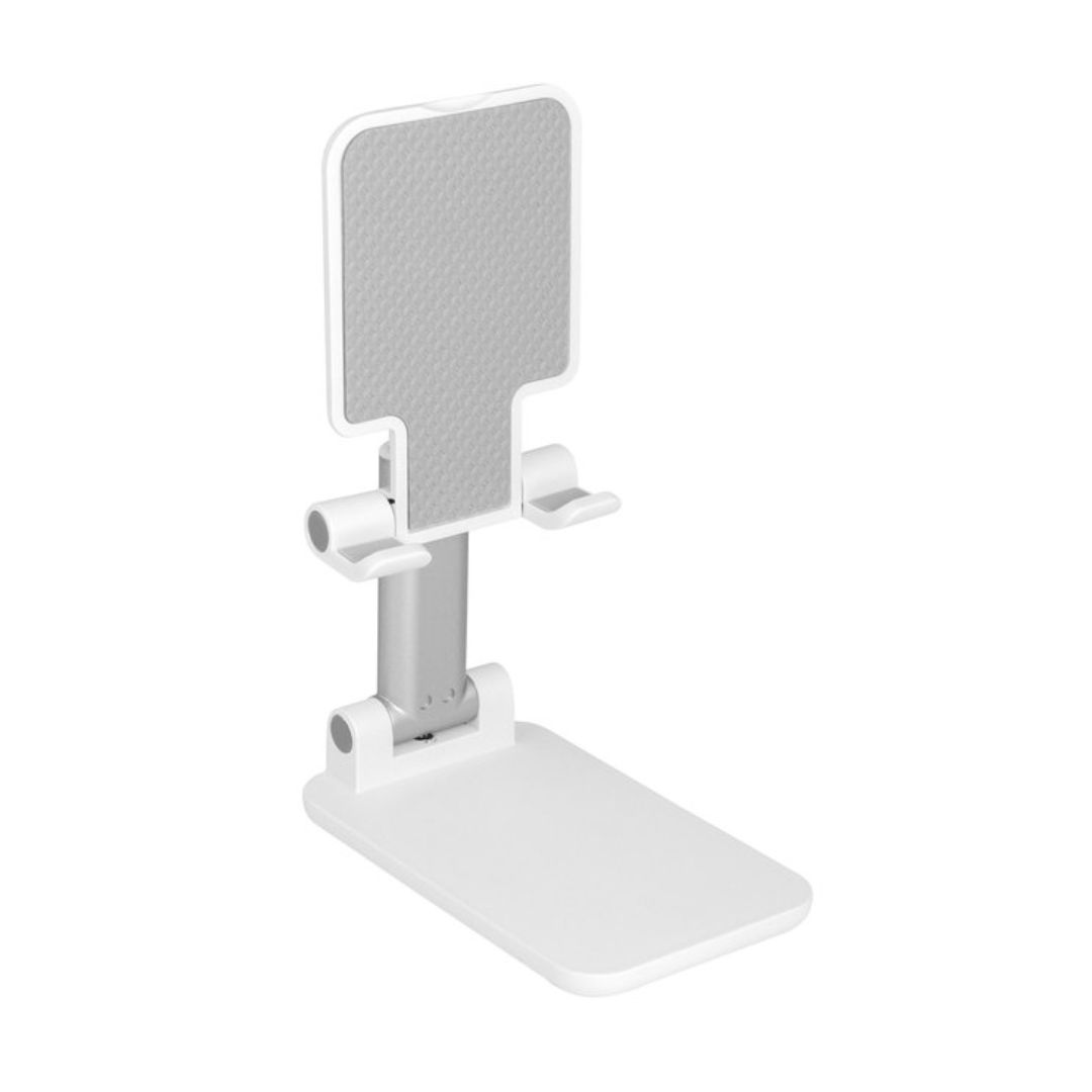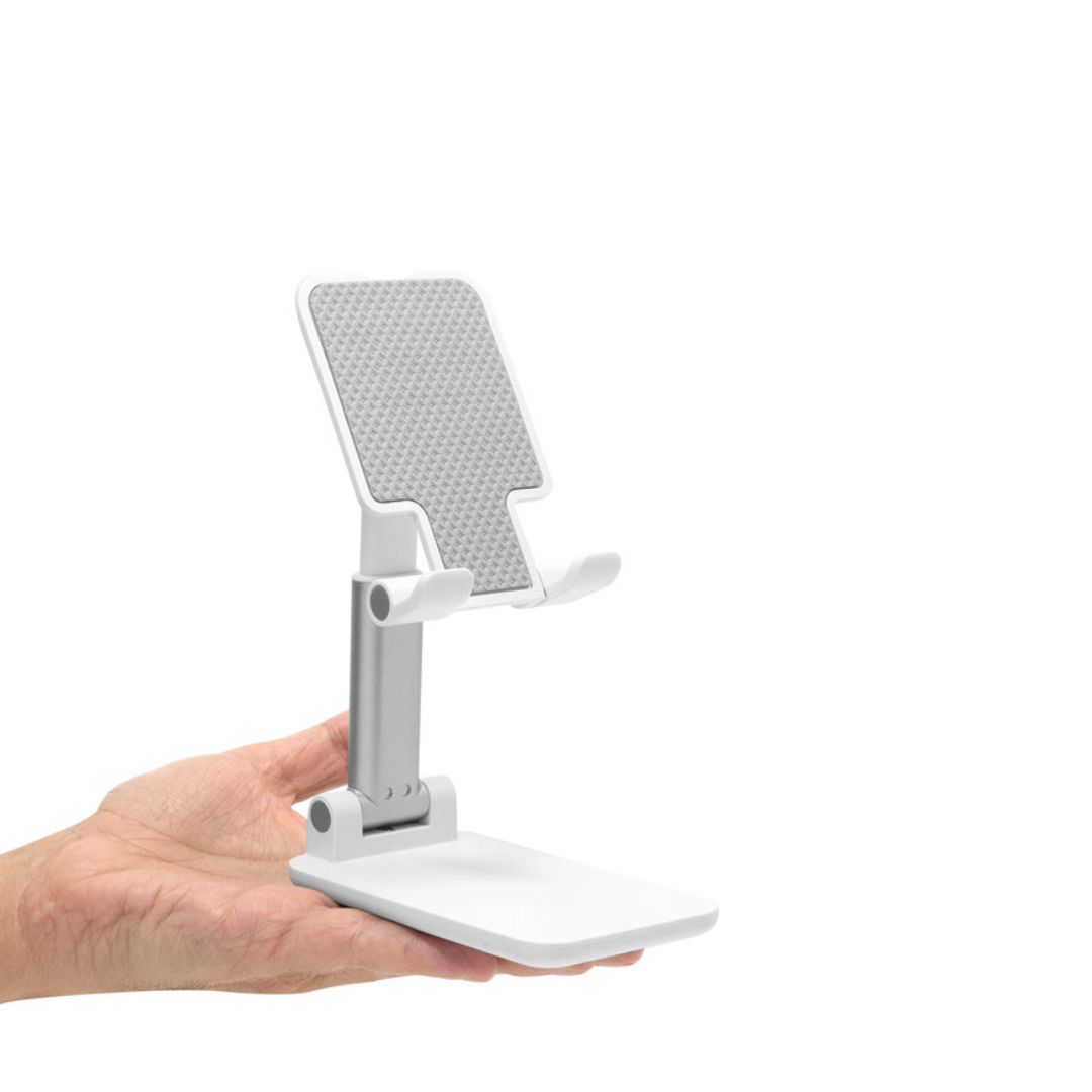 Descripción del producto: Soporte plegable para móvil. Tiene un sistema extensible de ajuste de altura e inclinación para posicionar el celular. Base con apliques de silicona antideslizantes.