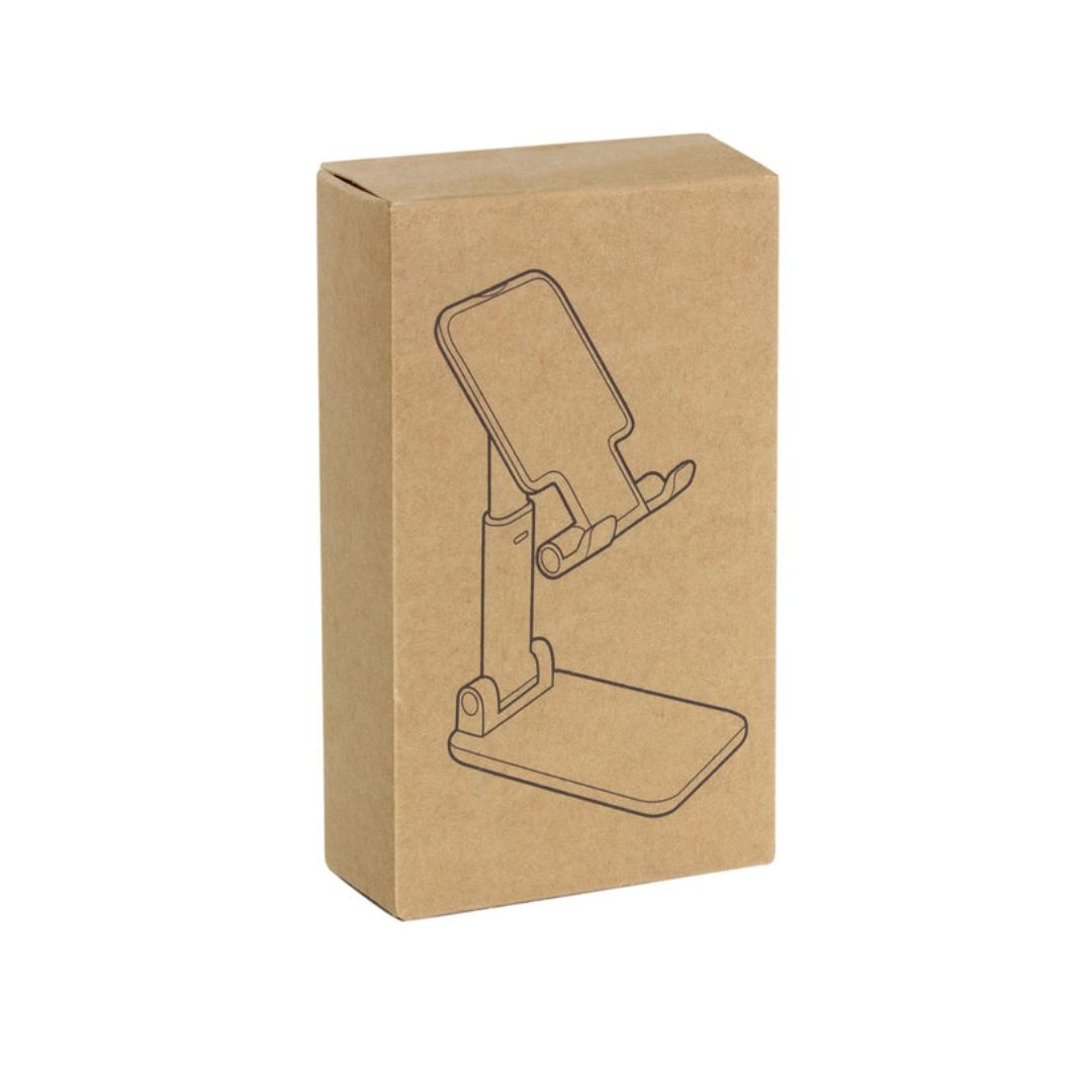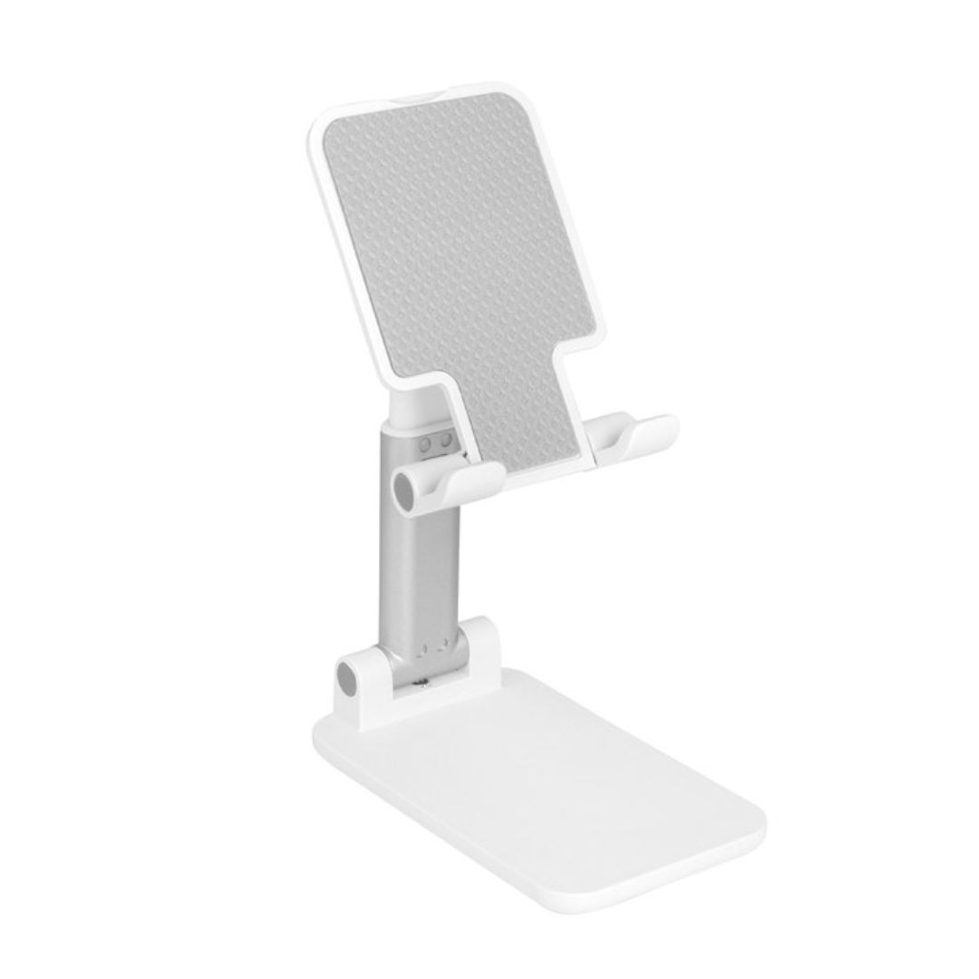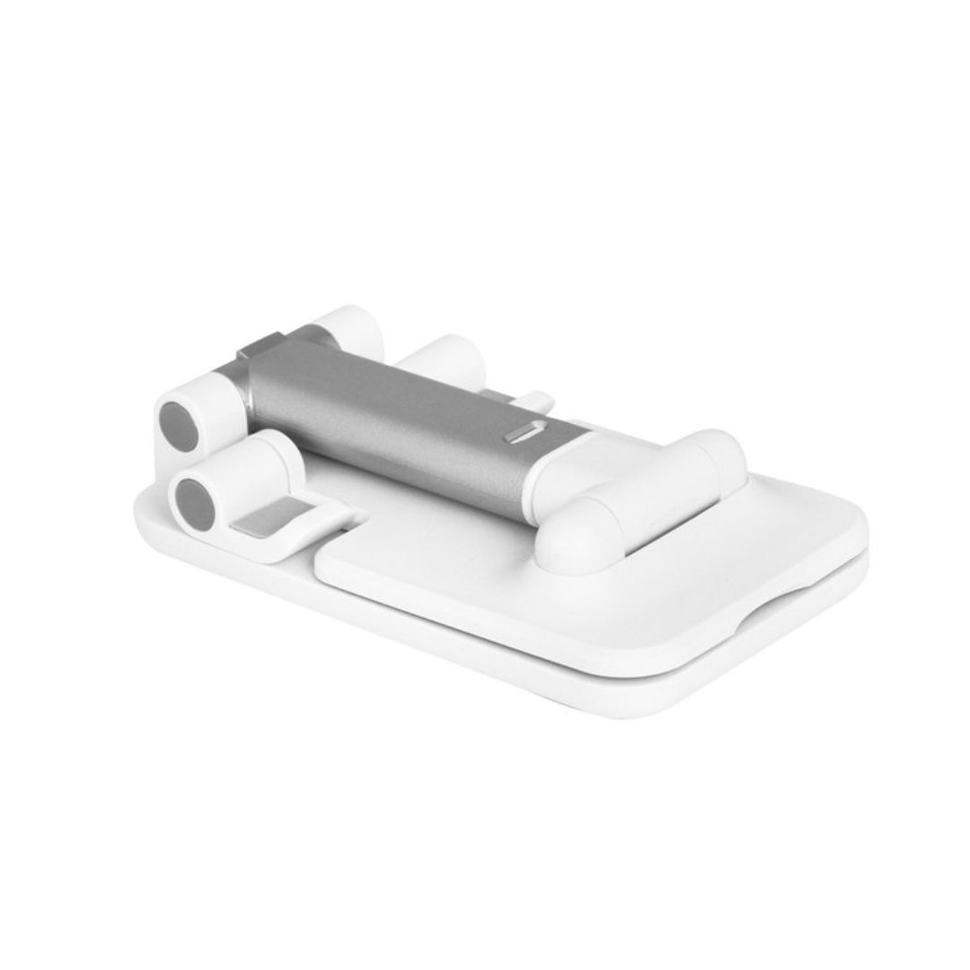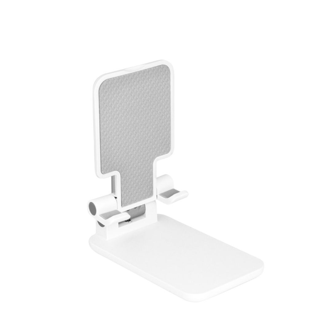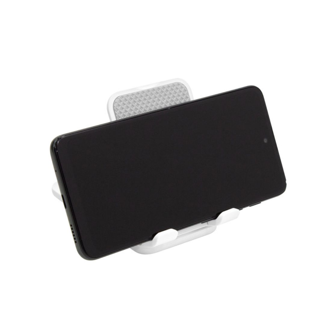Descripción del producto: Soporte plegable para móvil. Tiene un sistema extensible de ajuste de altura e inclinación para posicionar el celular. Base con apliques de silicona antideslizantes.