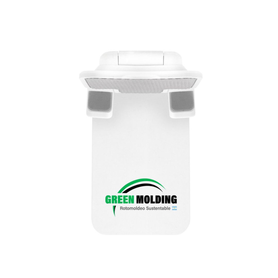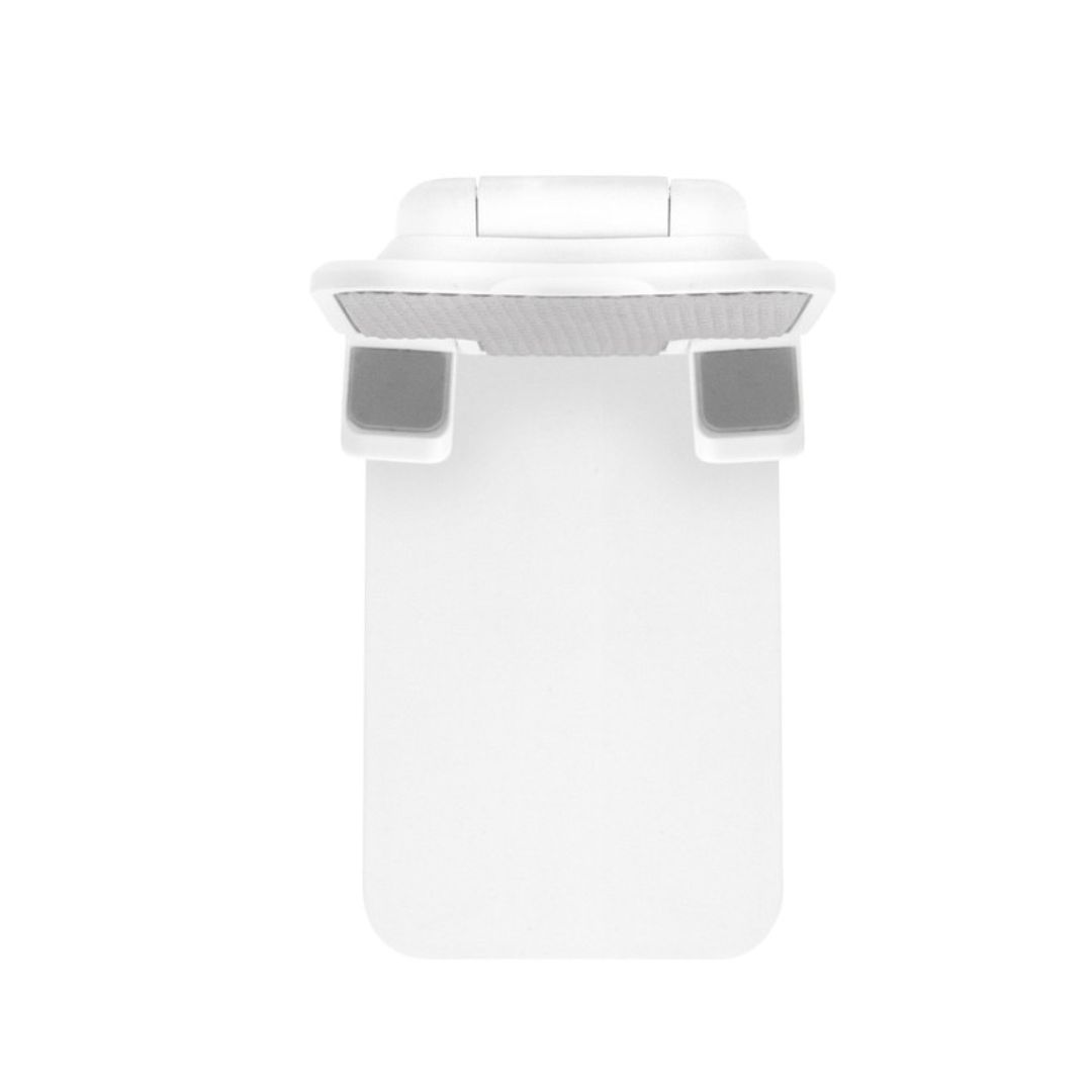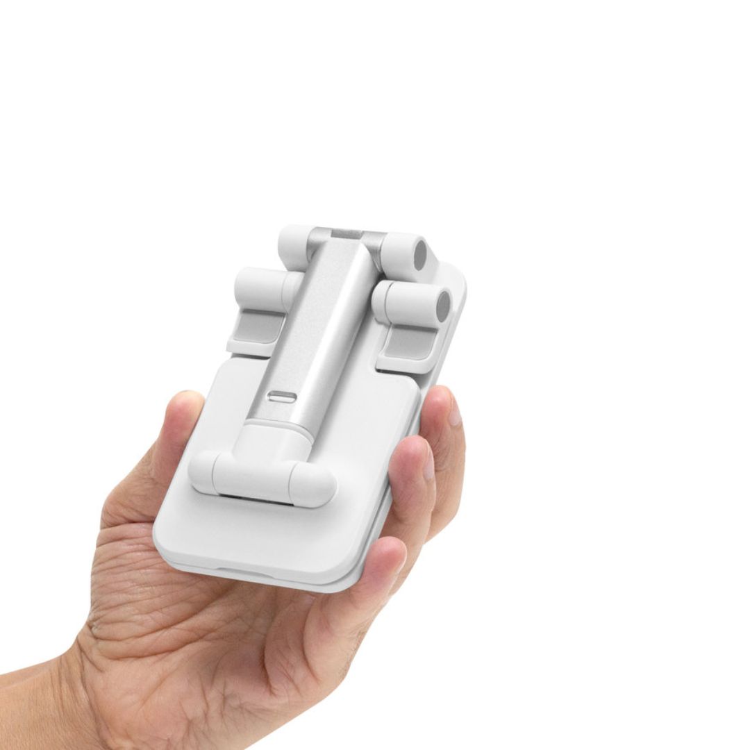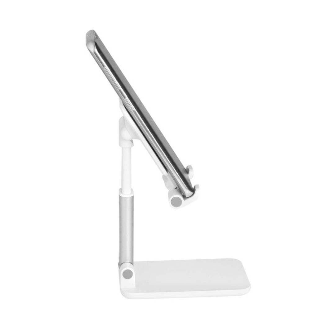 Descripción del producto: Soporte plegable para móvil. Tiene un sistema extensible de ajuste de altura e inclinación para posicionar el celular. Base con apliques de silicona antideslizantes.