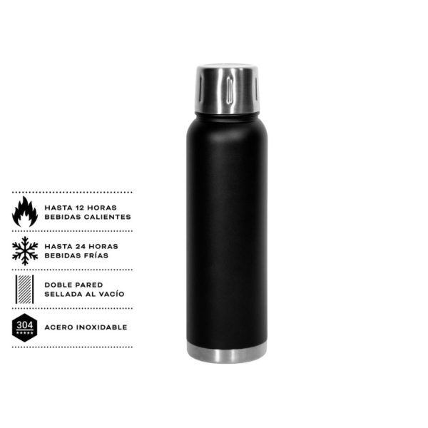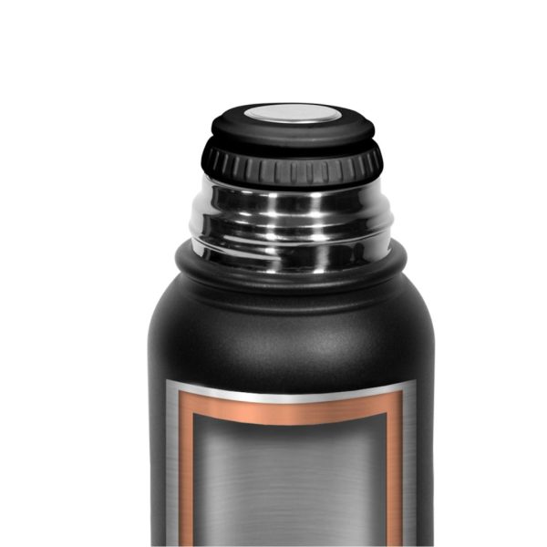 Descripción del producto: 8,4 x 30 cm. Capacidad 1000 ml. Acero inoxidable. Termo Doble pared con recubrimiento de cobre. Interior en acero 304 y exterior en acero 201. Pintura Powder Coat (pintura mas duradera y resistente a la corrosión y el paso del tiempo). Tapa de acero a rosca. Tapón con apertura y cierre a presión. Mantiene por más de 12 hs la temperatura de las bebidas calientes y 24 hs de las bebidas frías. Presentación en caja de regalo.